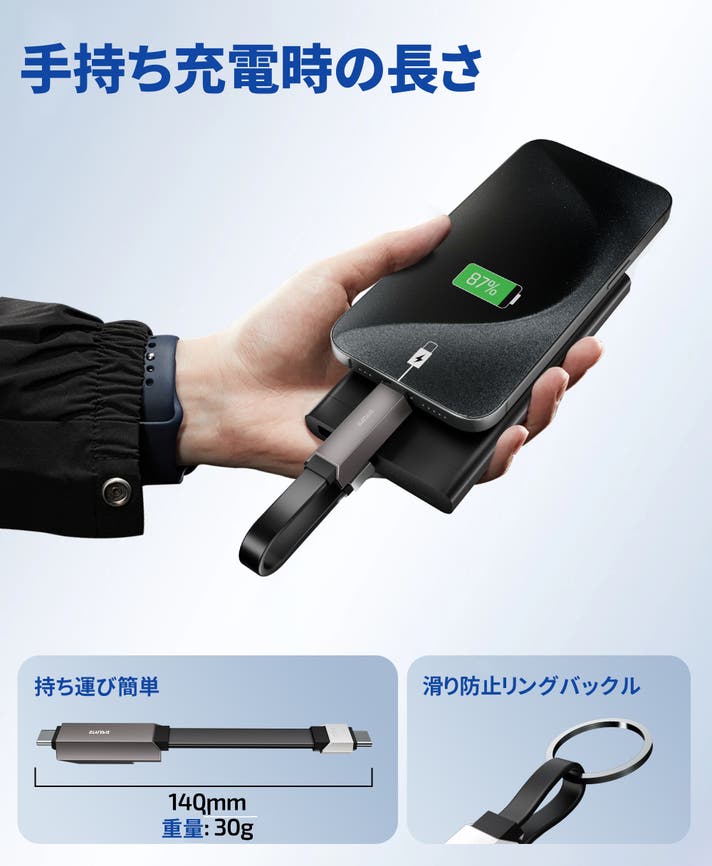 充電時のケーブル長さは最小限だからいい!特に外出の際はケーブルが邪魔にならず快適。使ったらわかる快感さを是非ご体感ください!