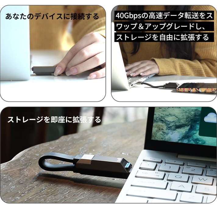 最大 40Gbps の速度で、大きなファイル、4K ビデオ、RAW 画像を メモリカードからデバイスに瞬時に転送します。