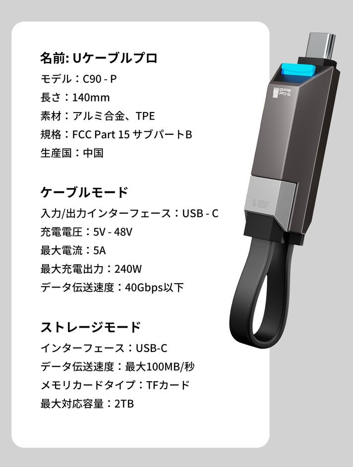 UCableは、メモリカードスロット付き(マイクロSD&TFカード)、2TBまでのストレージ拡張機能、40Gbpsの転送速度、そして240Wの急速充電をひとつのコンパクトデバイスに集約しました。