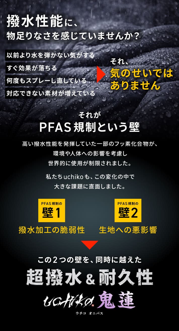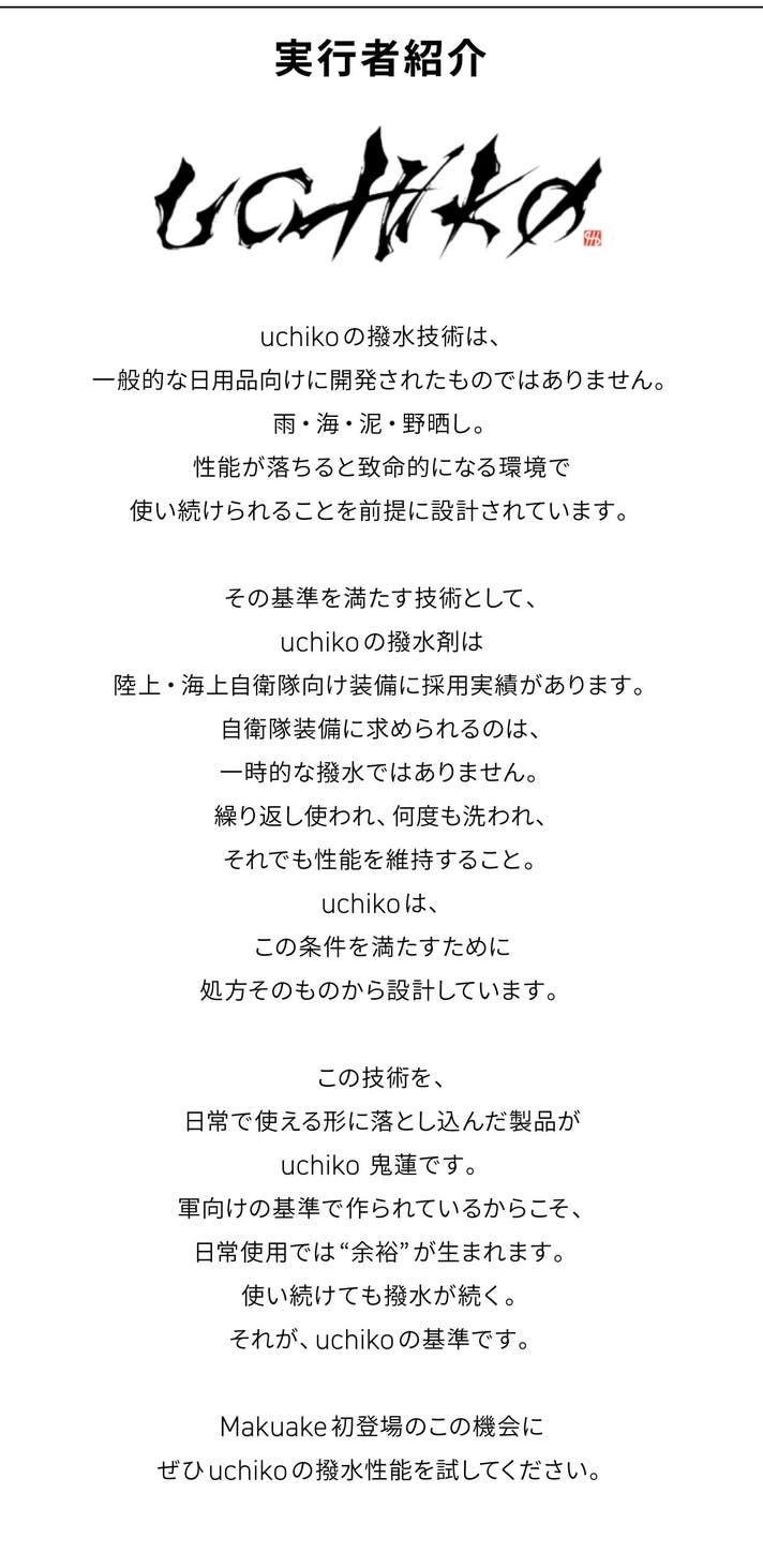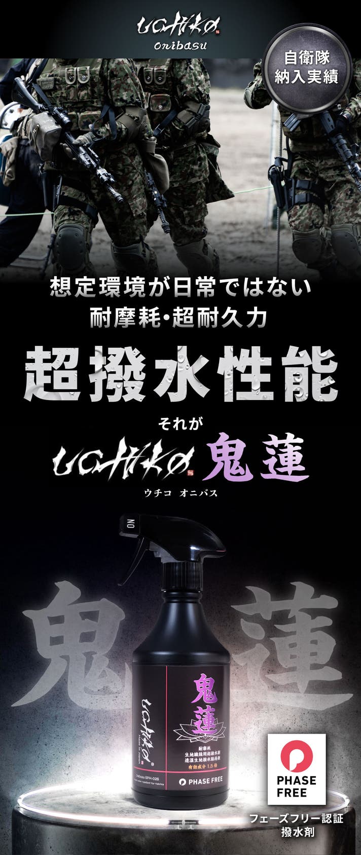 自衛隊向け装備など、過酷な環境を前提に設計。uchiko鬼蓮Onibasuは、特定の用途向けに作られた撥水剤ではありません。