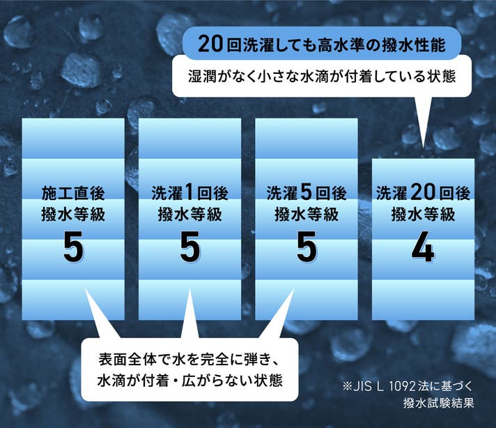 - 洗濯20回後も続く驚異の持続力。一度の施工で終わらない、過酷な豪雨や泥汚れからも守り抜く耐久性