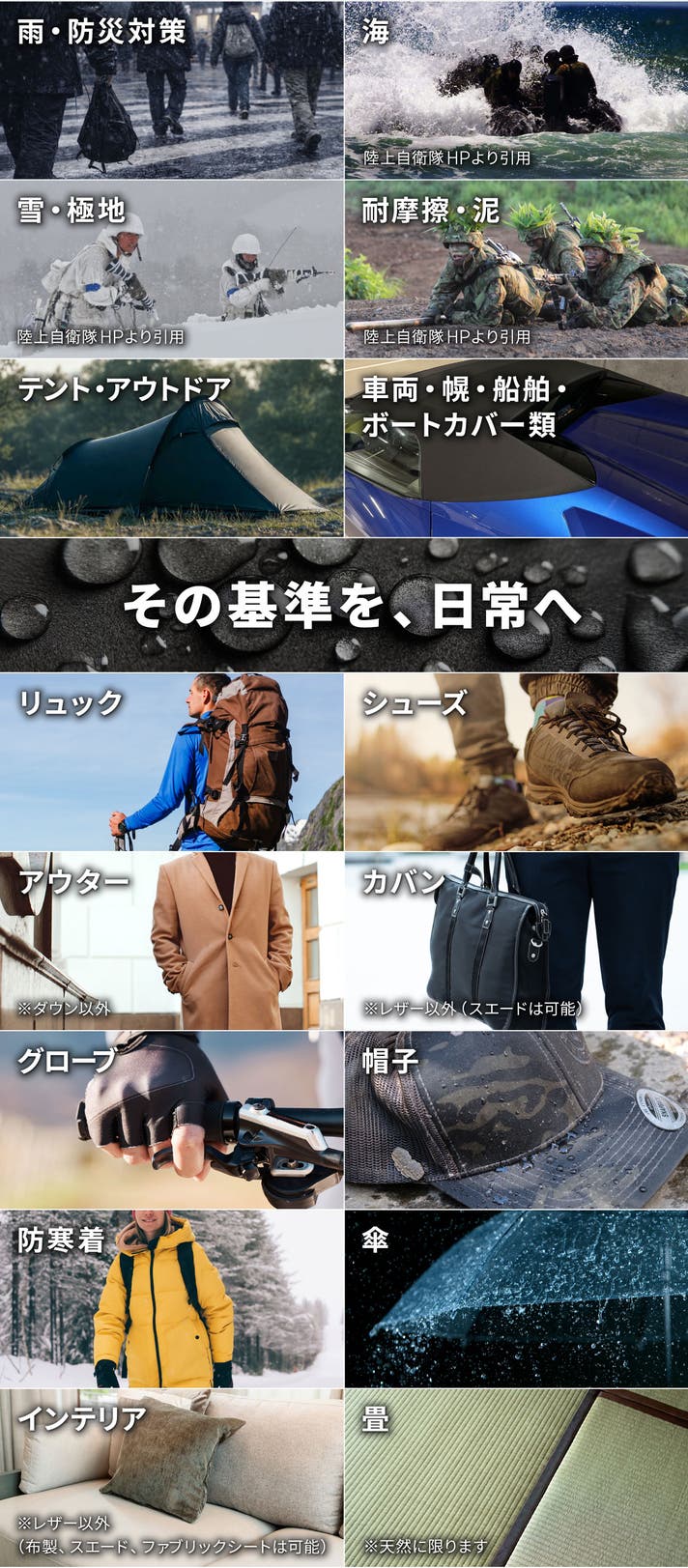 - 軍向け基準の超撥水技術が遂に一般解禁。過酷な環境を想定して開発された自衛隊導入の圧倒的撥水!
