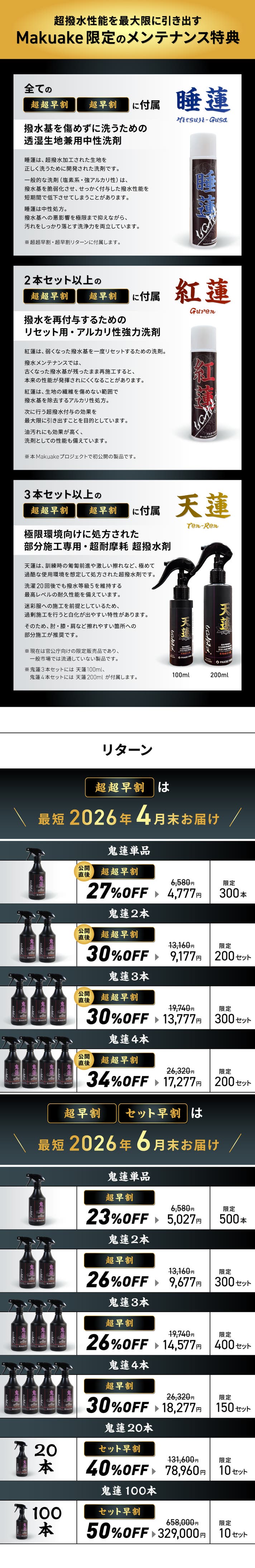 【セット早割】約50%OFF 耐摩耗生地専用超撥水剤 鬼蓮100本セット