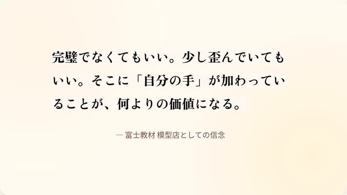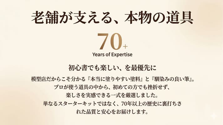 全国最優秀賞2冠のモデラーによる品質管理と模型店として長年培ってきた技術と、モノづくりの楽しさを、大切な家族の思い出づくりに活かしたい。