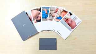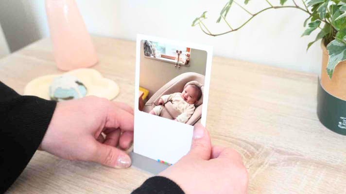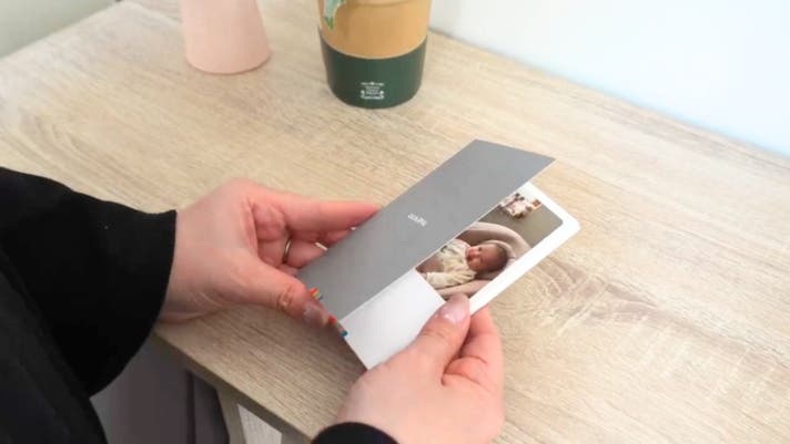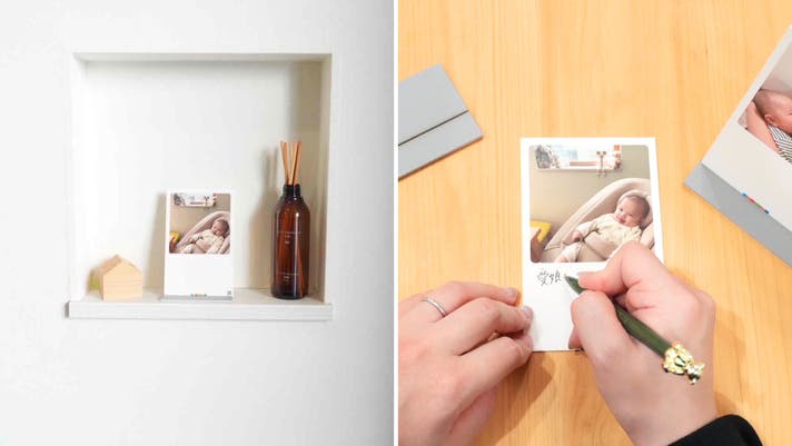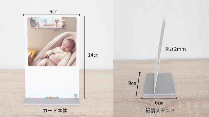 UchiPicは、届いたその場に「置くだけ」で飾れる、職人仕立てのフォトカードです。厳選された高品質な紙を精密に貼り合わせる「合紙(ごうし)」製法を採用。贅沢な「2mm厚」は赤ちゃんが手に取っても折れ曲がりにくく 、「無反射仕上げ」によって、照明の下でも愛おしい表情をクリアに映し出します。