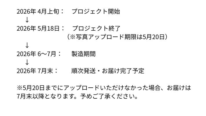 (5月20日までにアップロードいただけなかった場合、お届けは7月末以降となります。予めご了承ください。)