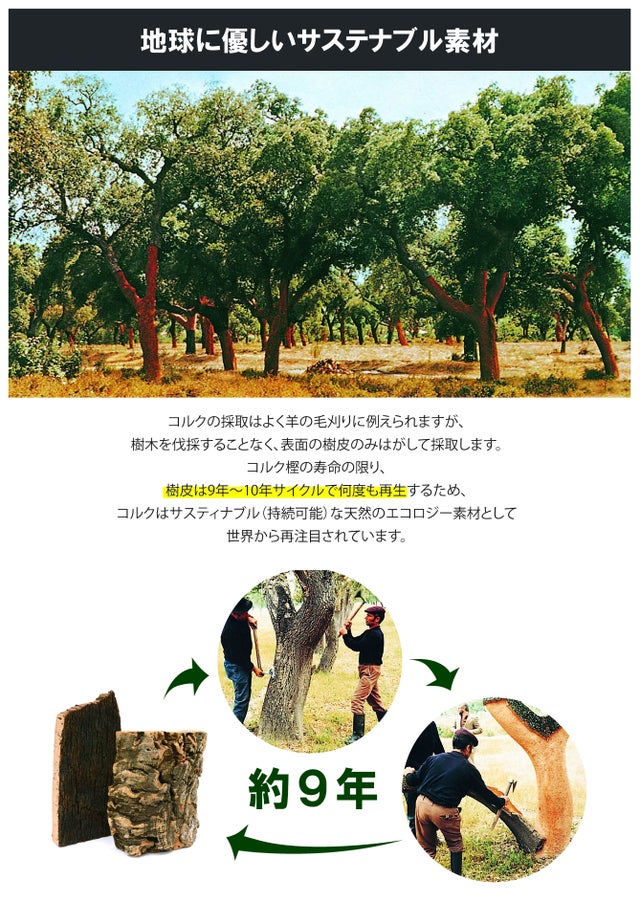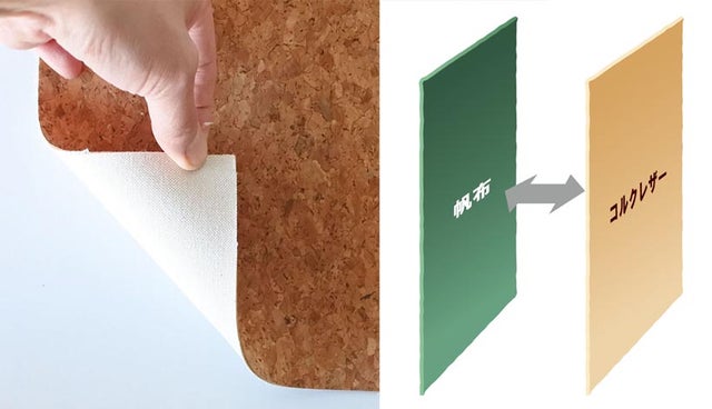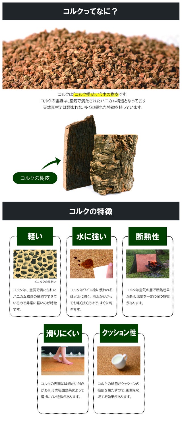 「軽い」「水に強い」「滑りにくい」などコルクの特徴はそのままに、天然素材の優しい風合いを触って感じることができます。