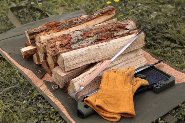 ホームセンター等で販売されている広葉樹薪の束(約7kg)と、様々なギアを入れて使うことができます。