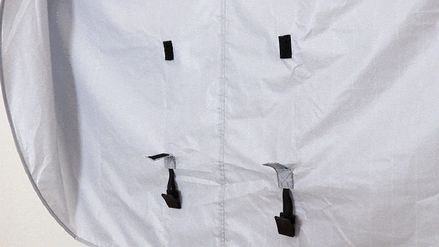 フードの透明窓部分のボタンを2か所留めることで、顔面を覆う立体形状のフードになります。