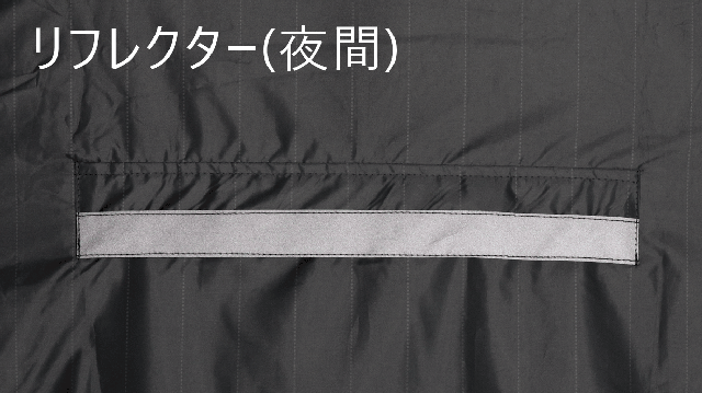 左右側面と背面にリフレクター(反射生地)が有るので、夜間の運転でも安心です。背面リフレクターは約幅2.5cm×長さ30cmと大きなサイズなので、車の運転手にもしっかり存在をアピールできます。