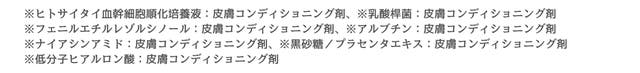 全成分: サッカロミセス/(黒砂糖/プラセンタエキス)発酵液、イソペンチルジオール、BG、プロパンジオール、ペンチレングリコール、アセチルヒアルロン酸Na、ナイアシンアミド、ヒアルロン酸Na、ヒアルロン酸クロスポリマー-2-Na、加水分解ヒアルロン酸Na、ヒトサイタイ血幹細胞順化培養液、アラントイン、アルブチン、グリチルリチン酸2K、オニイチゴ根エキス、キイチゴエキス、クズ根エキス、コンフリー葉エキス、ソメイヨシノ葉エキス、フェニルエチルレゾルシノール、ボタンエキス、マンダリンオレンジ果皮エキス、ユキノシタエキス、水溶性プロテオグリカン、乳酸桿菌/セイヨウナシ果汁発酵液、乳酸桿菌/ブドウ果汁発酵液、PCA-Na、ヒポファエラムノイデス果実油、ベタイン、カニナバラ果実油、キサンタンガム、メチルグルセス-10、シリカ、ポリソルベート20、エチルヘキシルグリセリン、フェノキシエタノール、水