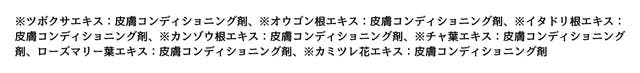全成分: 温泉水、BG、ペンチレングリコール、水、ナイアシンアミド、ヒトサイタイ血幹細胞順化培養液、アルブチン、乳酸桿菌、イタドリ根エキス、オウゴン根エキス、カミツレ花エキス、カンゾウ根エキス、コンフリー葉エキス、チャ葉エキス、ツボクサエキス、フェニルエチルレゾルシノール、マンダリンオレンジ果皮エキス、ローズマリー葉エキス、PCA-Na、グリコシルトレハロース、ヒポファエラムノイデス果実油、加水分解水添デンプン、コハク酸ジエトキシエチル、マルトデキストリン、シリカ、フェノキシエタノール