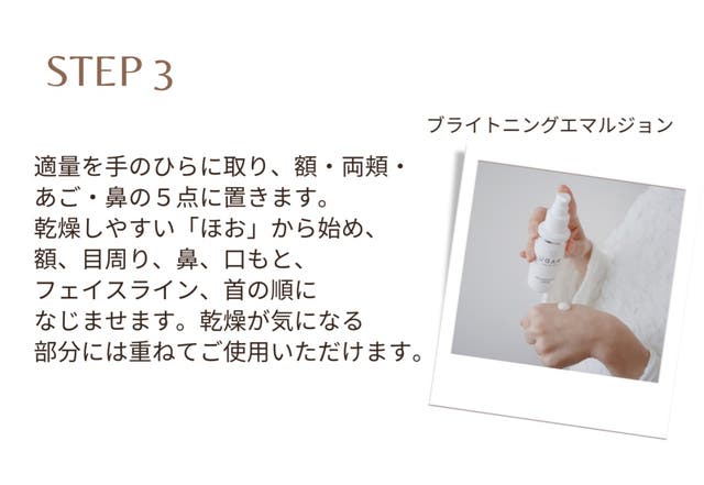ご使用方法: 化粧水でお肌を整えた後、適量に手に取り、お顔全体にやさしくなじませます。乾燥が気になる部分には重ねてご使用いただけます。