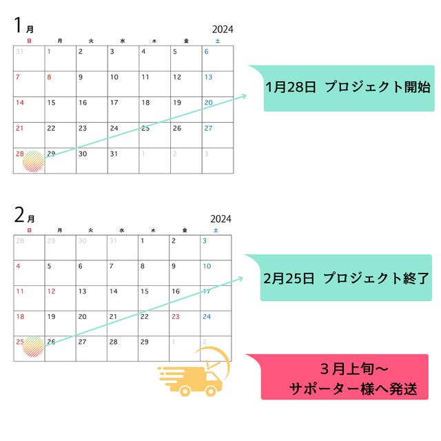 ※発送は2024年3月上旬頃より順次行います。 ※開発中の工程において、パッケージ・デザイン・仕様の一部が変更になる可能性がございます。 ※想定を上回る応援購入の申し込みがあった場合や、社会情勢・製造工程上の都合・ 配送作業に伴う止むを得ない事情等によりお届けが遅れる場合がございます。その際には、活動レポートにてご報告させていただきます。 ※使用感等に関連してのご返品・ご返金等はお受けいたしかねます。 ※本文中に記載させていただいたスケジュールは、あくまでプロジェクト公開時点のものです。応援購入の性質上、配送遅延等のおそれがございます。原則として、 配送遅延に伴う応援購入のキャンセルはできかねますが、リターン配送予定月から 4ヶ月を超えた場合には、ご希望者に限りキャンセルにて対応させていただきます。 以上の点につきまして、あらかじめご理解とご了承をいただいた上で応援くださいますよう、よろしくお願い申し上げます。