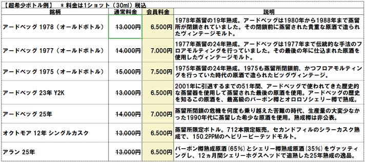 プレミアム会員権をご購入の方にはプレミアムボトルのショット(30ml)を1年間通常の半額で飲むことができます。加えてオーナーおすすめのスタンダードボトルを1年間月1回1杯を付けさせていただきます。とてもお得な会員権となりますので、モルトウイスキー愛好家の皆さんは是非ご検討ください。