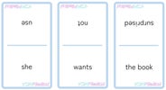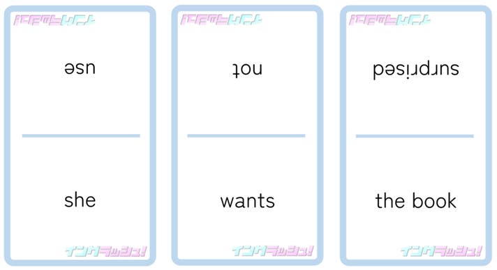 ルールはシンプル。カードの上下に書かれたどちらかの単語を使って、正しい英文を作ることを目指します。