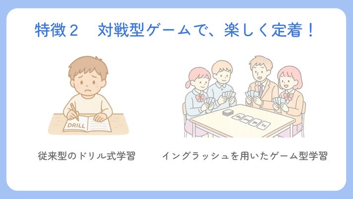 「学習=苦しい」から「学習=楽しい」へ転換させるカードゲームです。