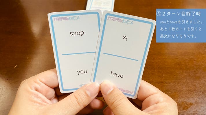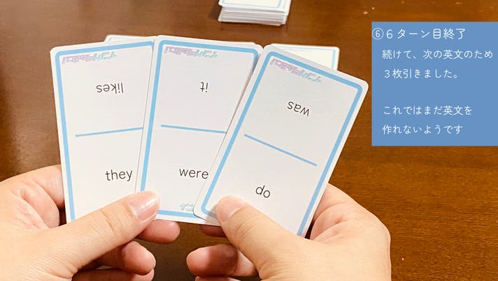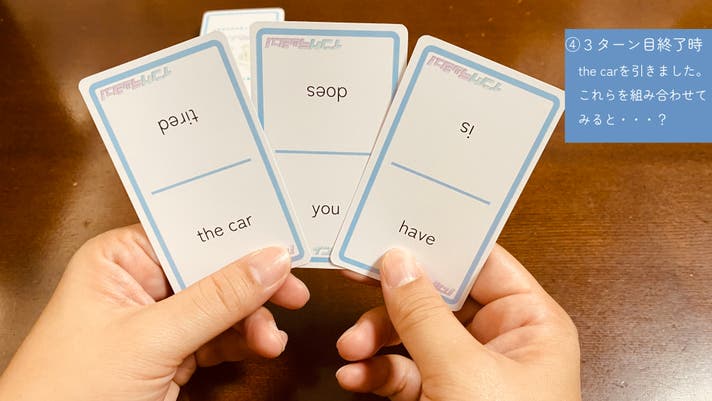 ② 配られたカードを確認し、どんな単語があれば英文が完成するか考えましょう。