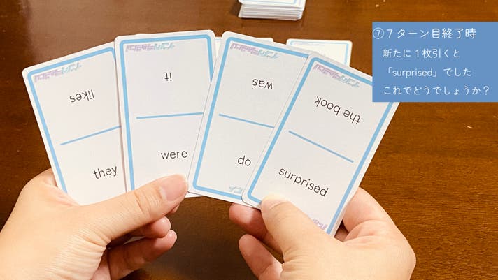 ⑤ 手持ちのカードを使って、テーブルに正しい英文になるよう並べましょう。