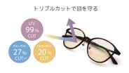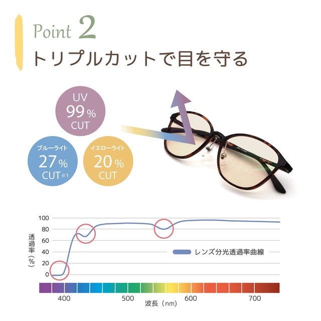 紫外線99.9%カット、ブルーライト27%カット、イエローライト20%カット。窓辺から入る日差しやデジタル機器の光から目を守り、長時間強い光を浴びる事による目の負担を軽減させます。