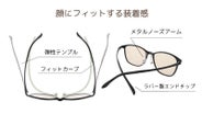 フレームの柔らかい弾性機能で顔を優しくホールド。フィッティング可能な鼻当て部と、滑りにくいラバー素材のエンドチップで、さらにフィット感を高めています。