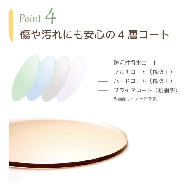 「薄くて軽い」「キズが付きにくい」「汚れにくく拭き取り易い」を追求したガラスレンズを凌駕するキズつきにくさを実現した4層による”エセンシアコート”をレンズ表面に施しています。