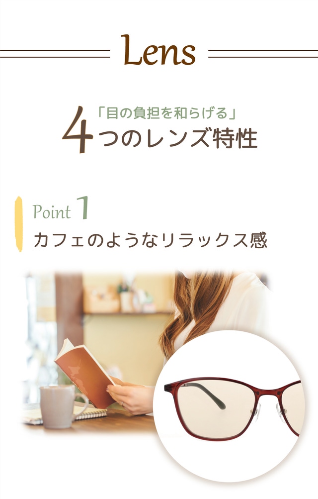 - まるでカフェにいるようなリラックス感。優しい暖色の空間を演出する杏子色レンズ