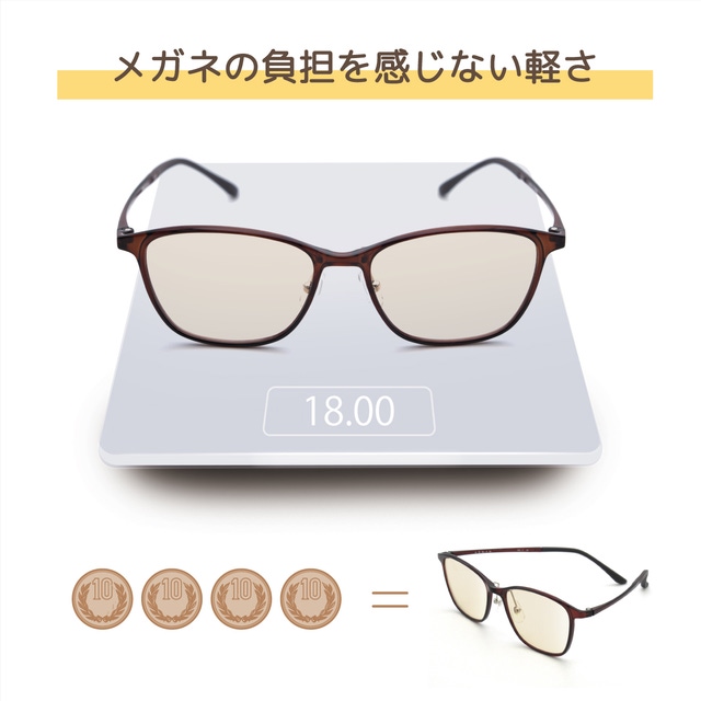 比重の軽く耐久性に優れたPPSU樹脂+ウルテム素材のスリムデザインで重さはわずか18グラム。10円玉4枚と同じ軽さで普段眼鏡をかけない方も違和感なくかける事ができます。