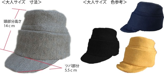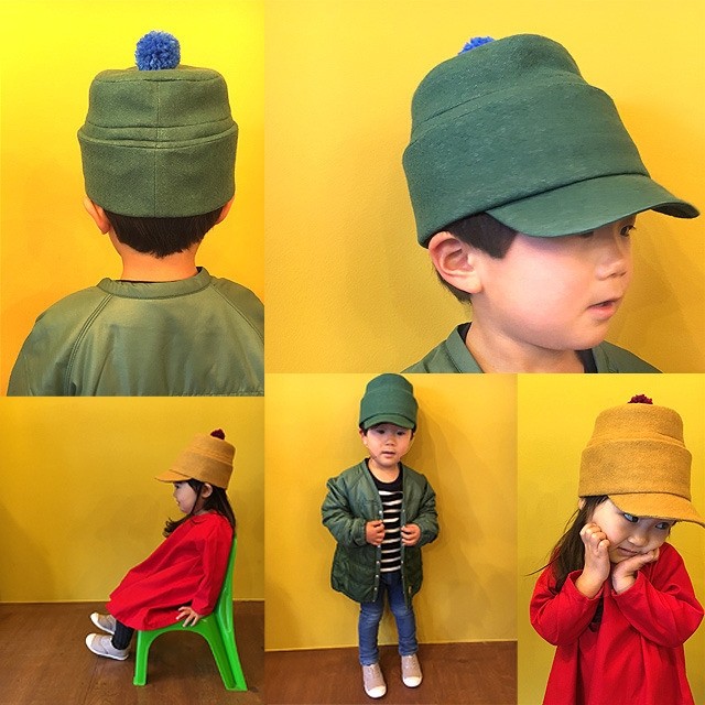 頭部分の形は、何度も調整を加えながら、完成させた高さのあるキャップになります。通常のキャップとは違いトップ部分の高さや円の大きさにはかなりこだわり、絶妙なバランスで仕上げました。親子でお揃いで被る事が出来ます☆