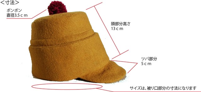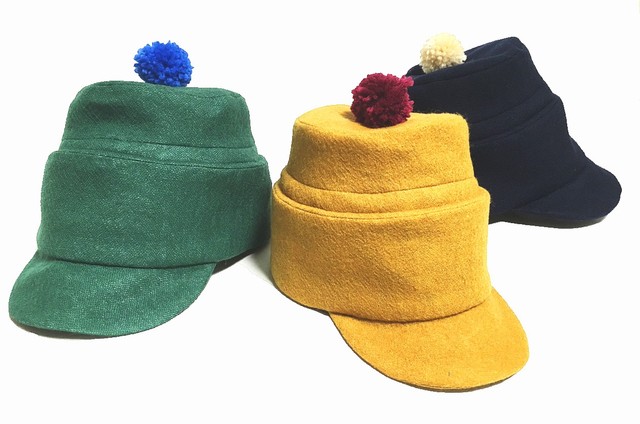 頭部分の形は、何度も調整を加えながら、完成させた高さのあるキャップになります。通常のキャップとは違いトップ部分の高さや円の大きさにはかなりこだわったバランスでしあげました。目立つ事間違いなし!トップにつけた小さめなポンポンが、さらに可愛らしさをプラスしてます。まるで、絵本から出てた鼓笛隊の様です。