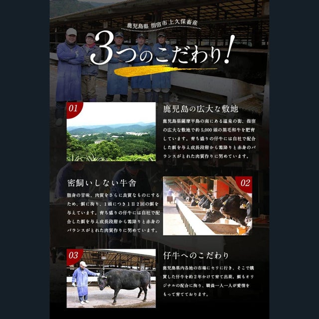 鹿児島県薩摩半島の南にある温泉の街、指宿の広大な敷地で約2,000頭の黒毛和牛を肥育しています。脂身の甘味、肉質をさらに良質なものにするため、餌に拘り、1頭につき1日2回の餌を与えています。