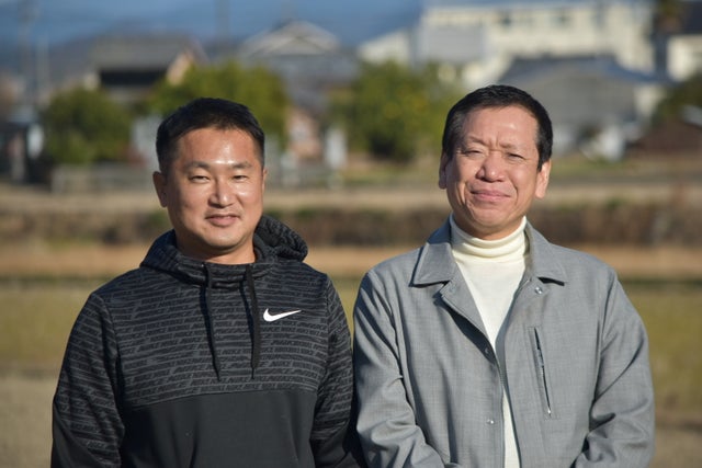 養殖場にて。左から生産者森田さんと当店店主の井口