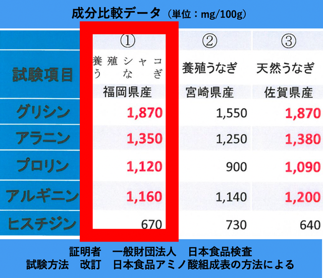 我々が使用する餌は、うなぎの脂を増加させるというフィッシュオイルの含有量を極力抑えているので、うなぎ本来の上質な脂をお楽しみ頂けます。実際に我々の餌を食べて育ったうなぎは旨味成分のアミノ酸のうち、食味が良いとされる遊離アミノ酸のグリシン、アラニン、プロリンについてが他の養殖うなぎと比較し最大で2割以上検査数値が上回りました。