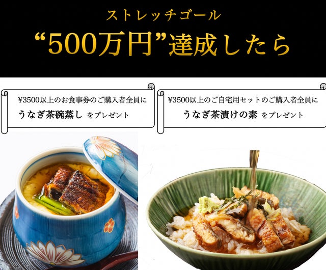 目標金額に到達できた場合には、3500円以上のリターンをご購入頂いた方で、お食事券をご購入された方々には「うなぎ茶碗蒸し」を、