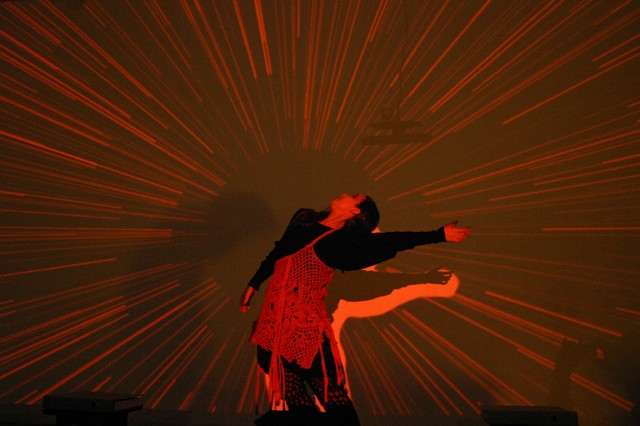 また日本で初の3Dモーションキャプチャリングセンサーの演劇利用(日本経済新聞電子版掲載)を行うなど、最新技術を用いた演出にも積極的に取り組んでいます。(写真上、舞台『増殖島のスキャンダル』。俳優の場所と動きを検知したリアルタイムの映像効果を実現。)