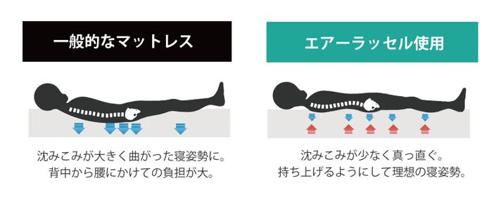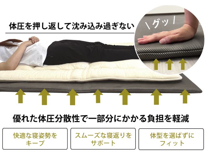 - しっかり支える高反発と体圧分散性でぺたんこなお布団もgoodな寝心地に生まれ変わる!