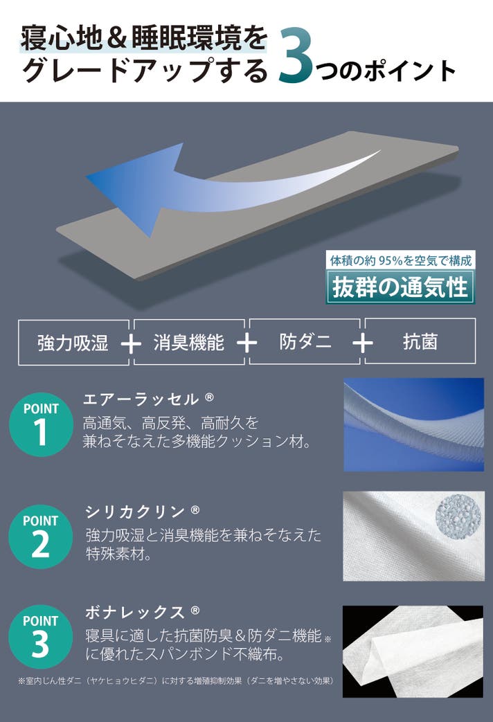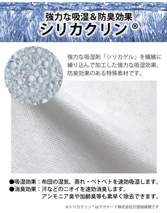 - 寝心地だけじゃない!吸湿消臭+抗菌防臭+防ダニの贅沢すぎる睡眠環境!※吸湿:シリカクリン®効果