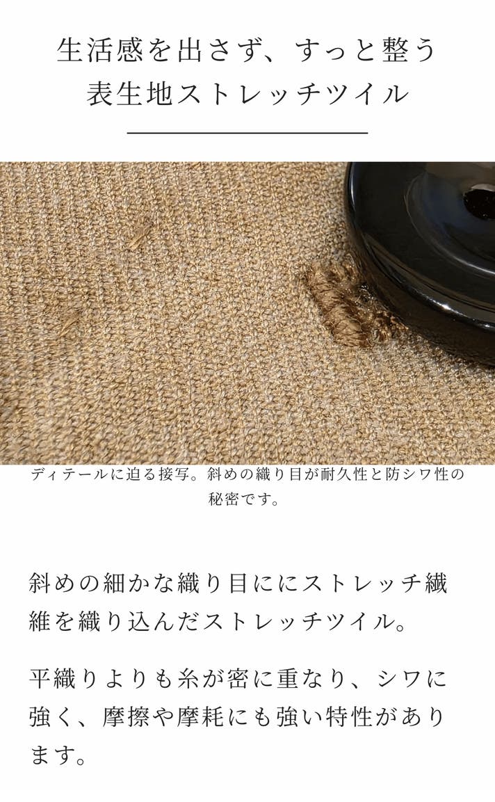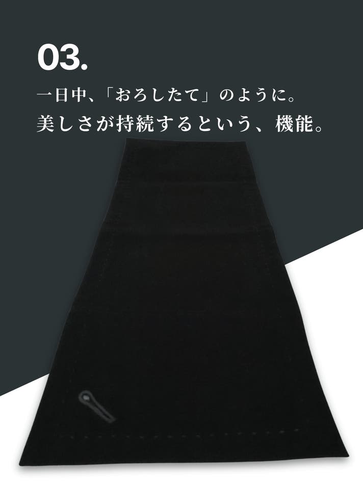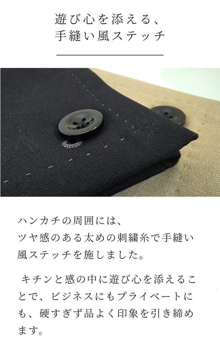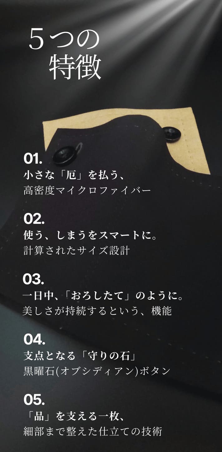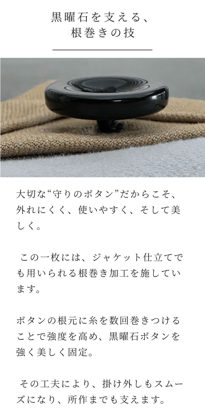 - 裏面に超微細マイクロファイバー、品を引き立てる黒曜石ボタン。所作も美しく見せる縫製設計