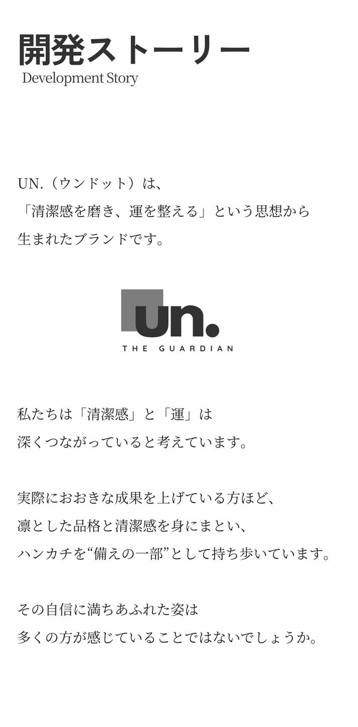 「Makuake(マクアケ)」は、実行者の想いを応援購入によって実現するアタラシイものやサービスのプラットフォームです。このページは、 プロダクトカテゴリの 「【運気は磨く時代へ】品格と機能を両立した、新時代の高機能ハンカチ「UN.」」プロジェクト詳細ページです。
