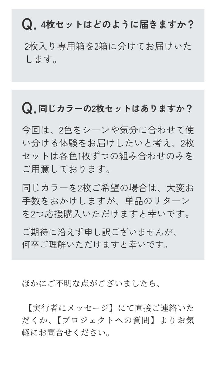 1つのギフトBOXに2枚(各色1枚ずつ)をセットにしてお届けします。ご自身で1箱お使いいただき、もう1箱を贈り物にする、といった使い分けも可能です。