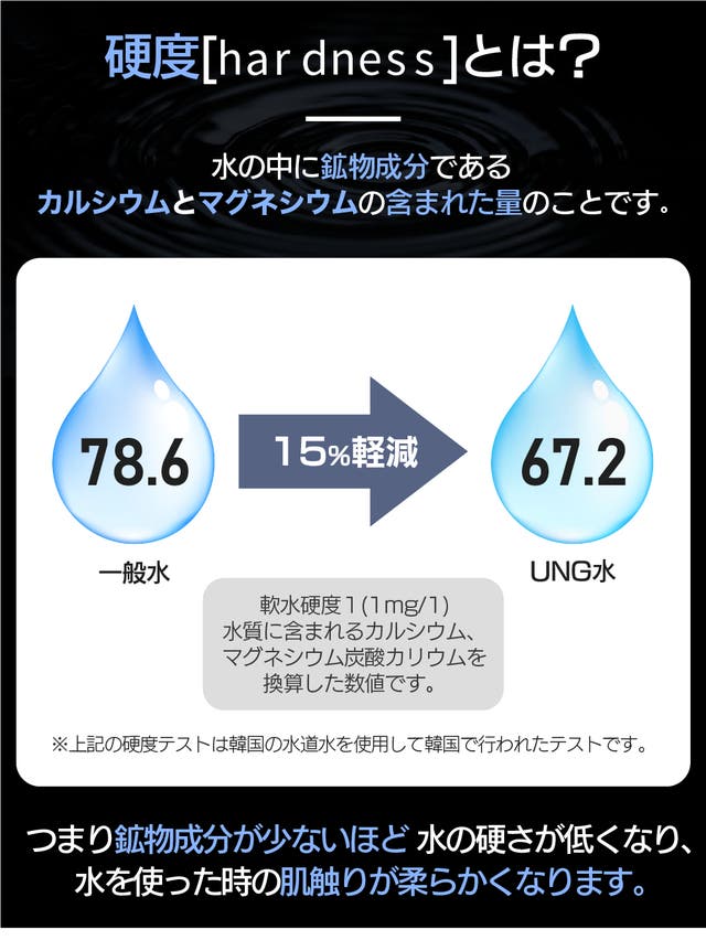 韓国衣類試験研究院が行った水道水による硬度検査によりますとUNG軟水器シャワーヘッドの使用後は硬度が約15%下がり、ソフトで洗浄力の高い水に軟水化されたことが分かりました。