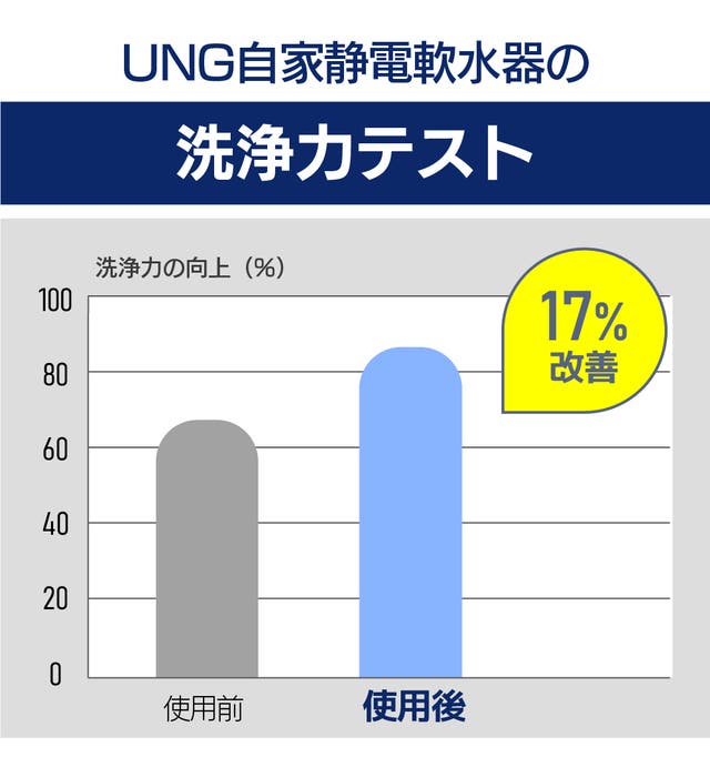 洗浄力試験によると、UNG軟水器シャワーヘッドを使用する前と使用後の洗浄力が17%も向上したことが確認できます。