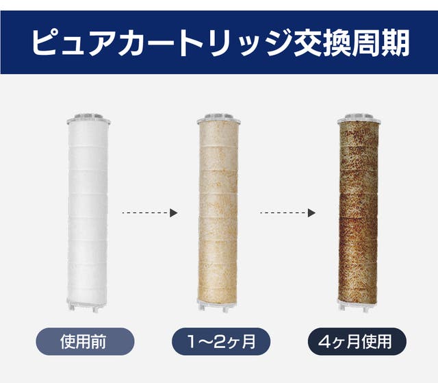 カートリッジの交換周期は1~2ヶ月ですが、水質によって周期は変わることがあり肉眼で見た時に汚染度がひどくなったり水圧が弱くなっていたら交換することをお勧めします。