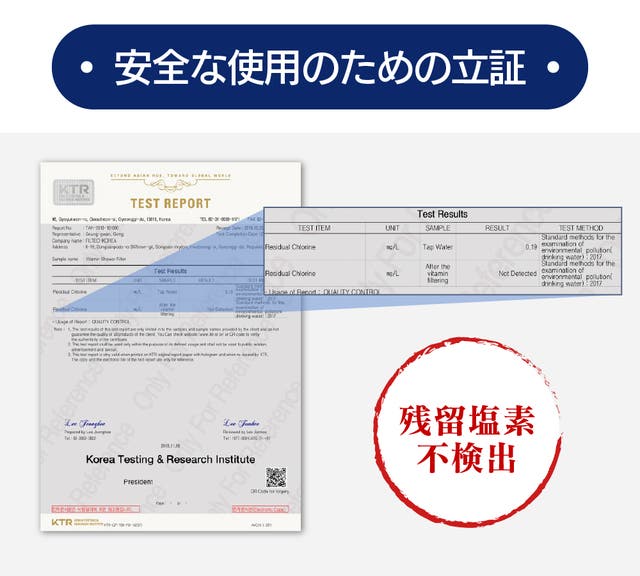 韓国化学融合試験研究院を通して行いました残留塩素テストで、ビタミンカートリッジが塩素除去効果があることが立証されました。