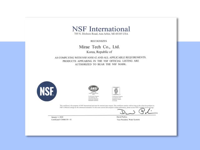 NSF認証はアメリカ国家公衆衛生局の認証により独立した非営利機関で、水、食べ物、空気および環境分野の規格開発および認証を行います。