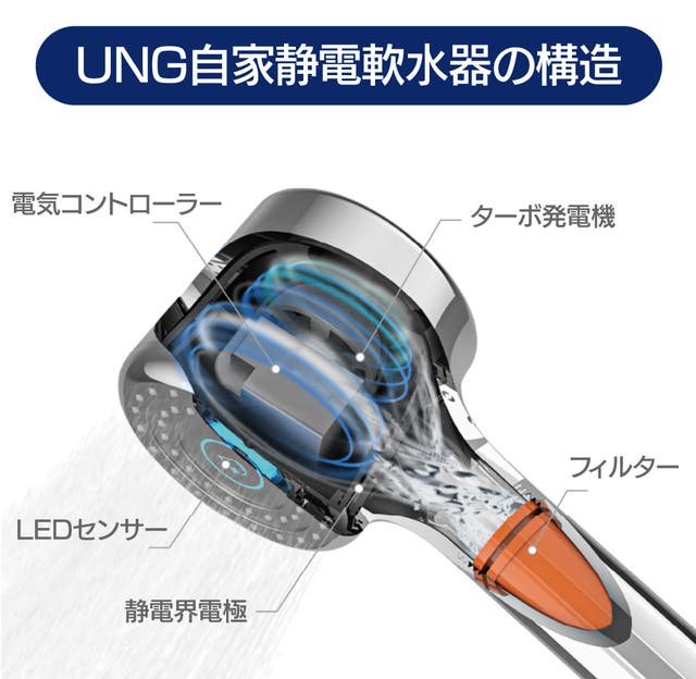 UNG軟水器シャワーヘッドは静電気モジュールで駆動される革新的な独自の電力供給技術で、シャワーヘッド内部の静電界電極を利用して稼動します。