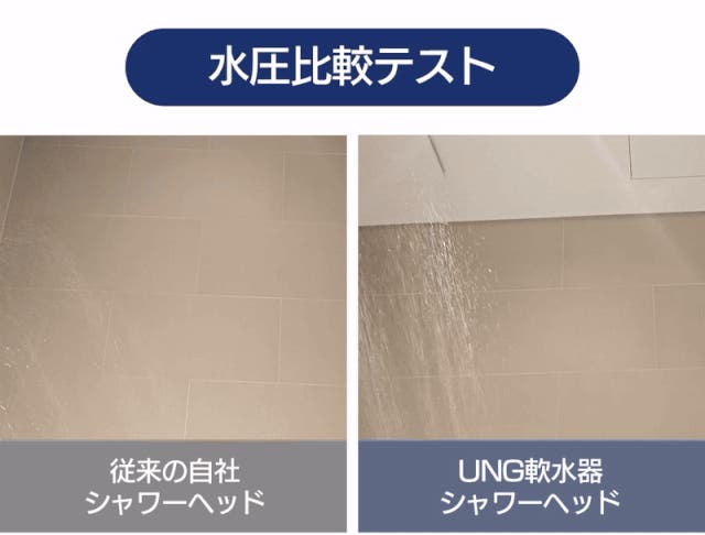 同じ量の水を流すテストを行った結果、従来の普通のシャワーとUNG軟水器のシャワーヘッドを比較してみると、UNG軟水器側の水圧がより強力であることが確認できます。