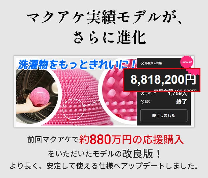 「Makuake(マクアケ)」は、実行者の想いを応援購入によって実現するアタラシイものやサービスのプラットフォームです。このページは、 プロダクトカテゴリの 「実績を重ねたモデルが進化。大型フィルター×通水構造の洗濯ボールPro」プロジェクト詳細ページです。