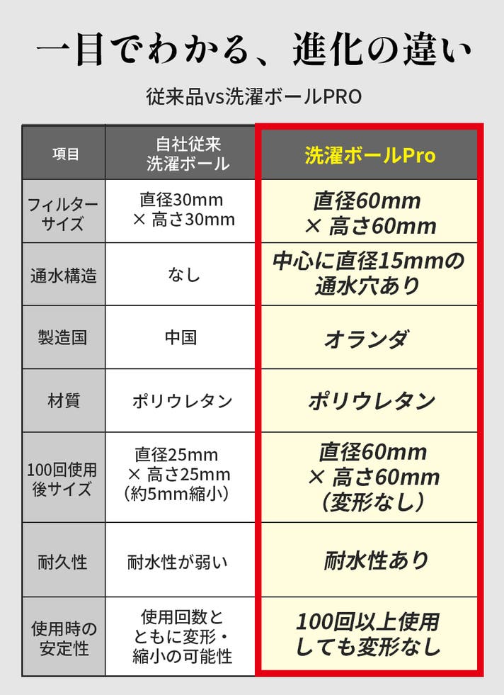 従来品では、使用回数の増加によりフィルターが縮小・変形する傾向が確認されています。一方で洗濯ボールPROでは、耐水性のあるフィルターを採用することで、100回使用後もサイズ・形状を維持することが確認されています。