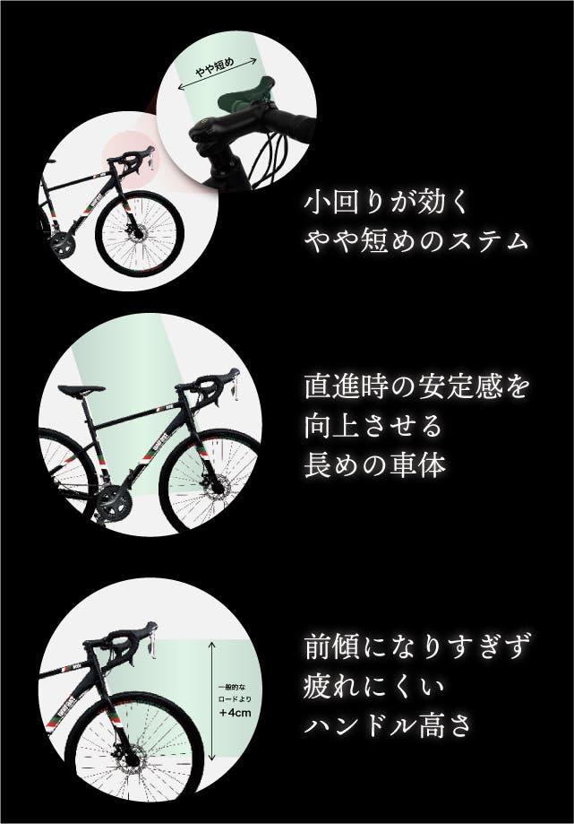 ※グラベルロード:ロードバイクの一種で、舗装路だけでなく砂利道(グラベル)も走れるように設計されたモデルのことです。タイヤがやや太く、安定性が高いため、通勤・通学や街乗りにも向いています。